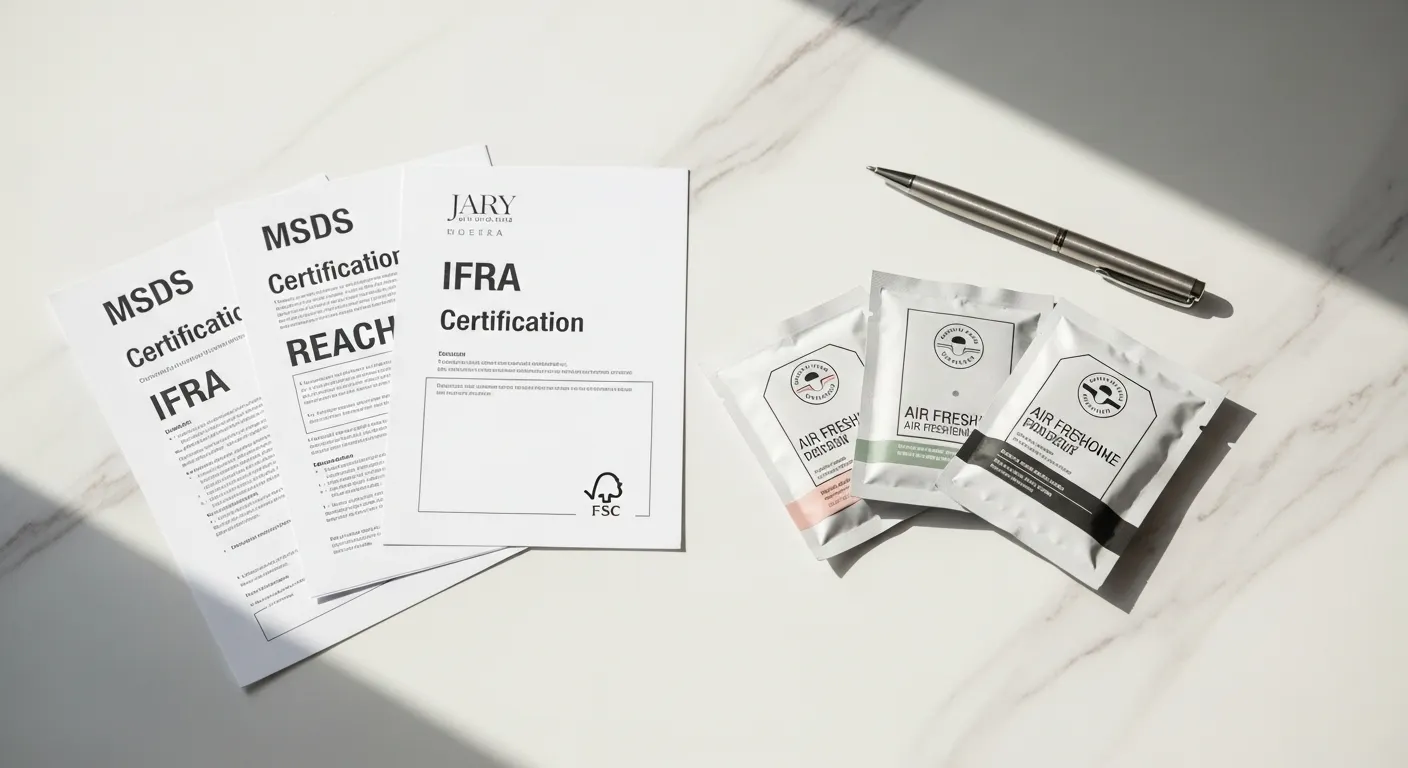 At minimum, request an MSDS (Material Safety Data Sheet) — this is required for UAE customs clearance of fragrance products. For retail distribution in UAE hypermarkets and pharmacies, also request an IFRA compliance certificate and REACH compliance confirmation. If targeting eco-conscious buyers or corporate gifting channels, request FSC certification for the paper substrate. Always request a Certificate of Origin (China) for GCC import duty documentation. Aroma Ease provides MSDS, IFRA, and REACH documentation as standard with all orders.