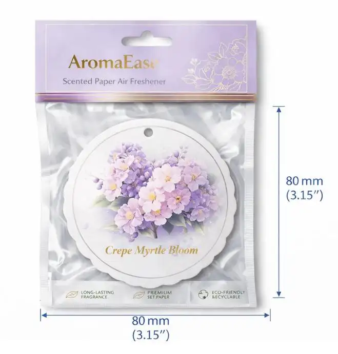 Aroma Ease addresses this with the OEM Crepe Myrtle Hanging Paper Air Freshener, which diffuses fragrance in a stable and consistent manner and incorporates soft floral design with custom OEMs. As a result, it offers stronger commercial appeal than a standard scent card built only around appearance.