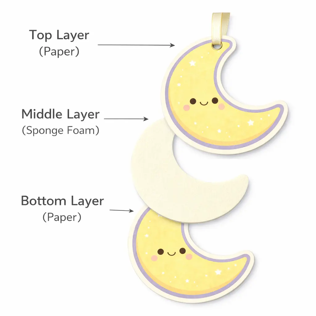 Most paper air fresheners use a 3-layer structure (Paper + Sponge + Paper). The sponge core absorbs fragrance oil and releases it gradually, ensuring a more stable and long-lasting scent