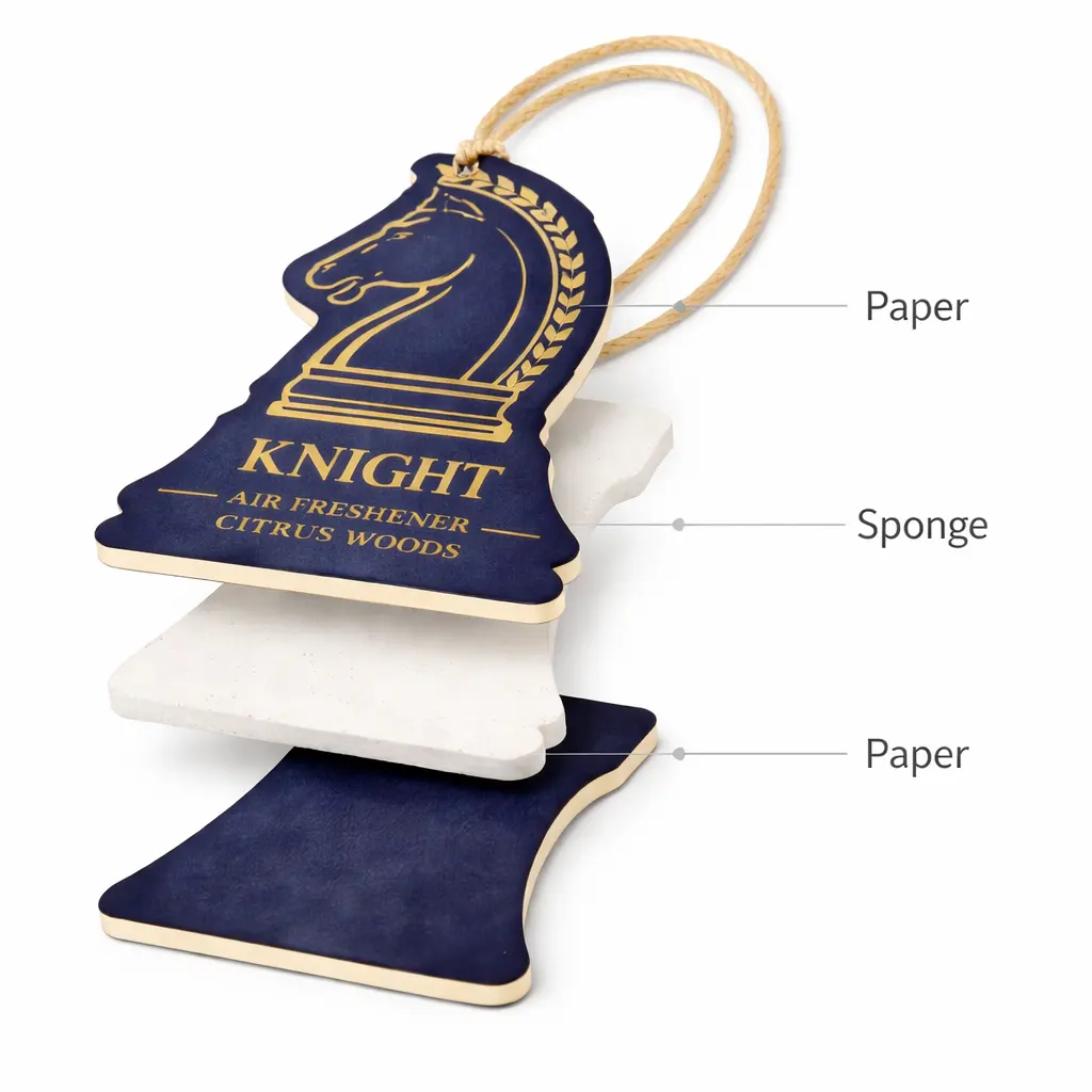 Refresh your space with this elegant Chess Knight Hanging Paper Air Freshener. Featuring a classic chess-inspired design and premium absorbent paper, it delivers a clean and long-lasting Citrus Woods fragrance.Perfect for cars, closets, key holders, or home decoration, it adds both scent and style to everyday spaces. Fully customizable in shape, fragrance, and packaging, making it ideal for brands, gifts, and promotional use.