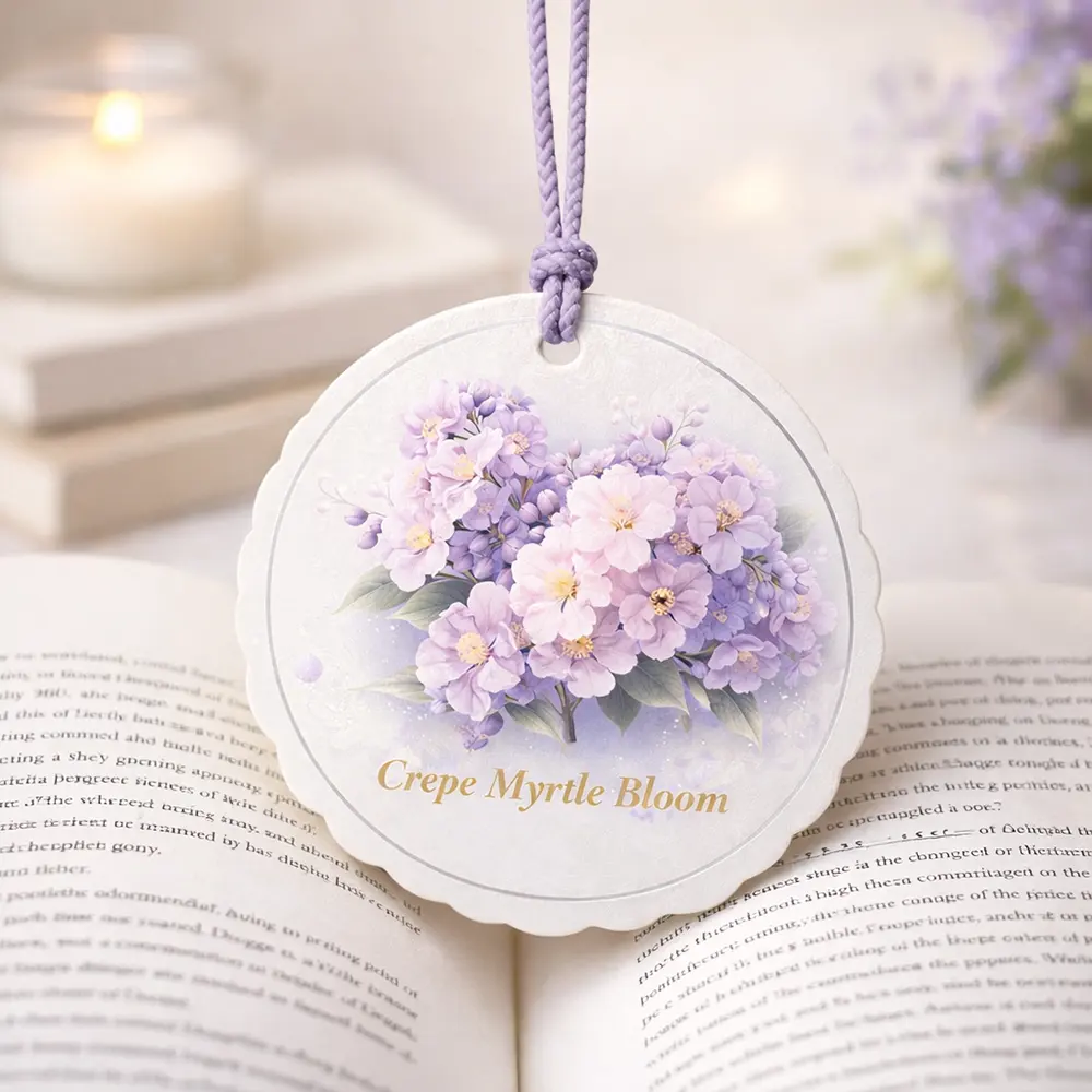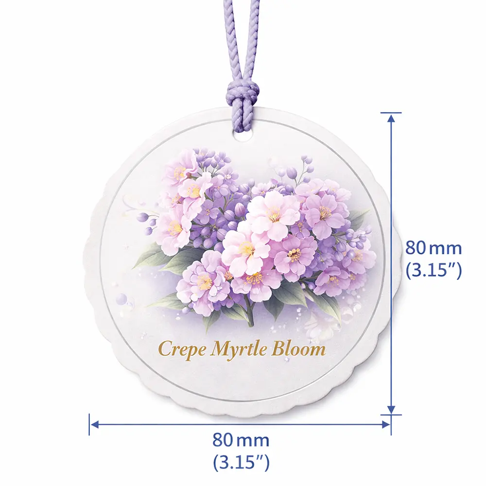 A delicate and elegant hanging paper air freshener inspired by Crepe Myrtle blossoms, featuring soft purple floral artwork and a refined circular design. Crafted with a multi-layer paper structure, it slowly releases a gentle, long-lasting fragrance, creating a calm and refreshing atmosphere. Perfect for use in cars, closets, or small indoor spaces, this air freshener combines aesthetic beauty with functional scent diffusion, making it an ideal choice for both everyday use and premium gift or branding applications.