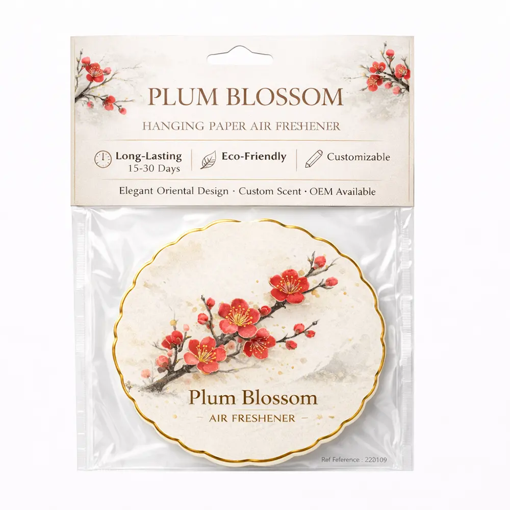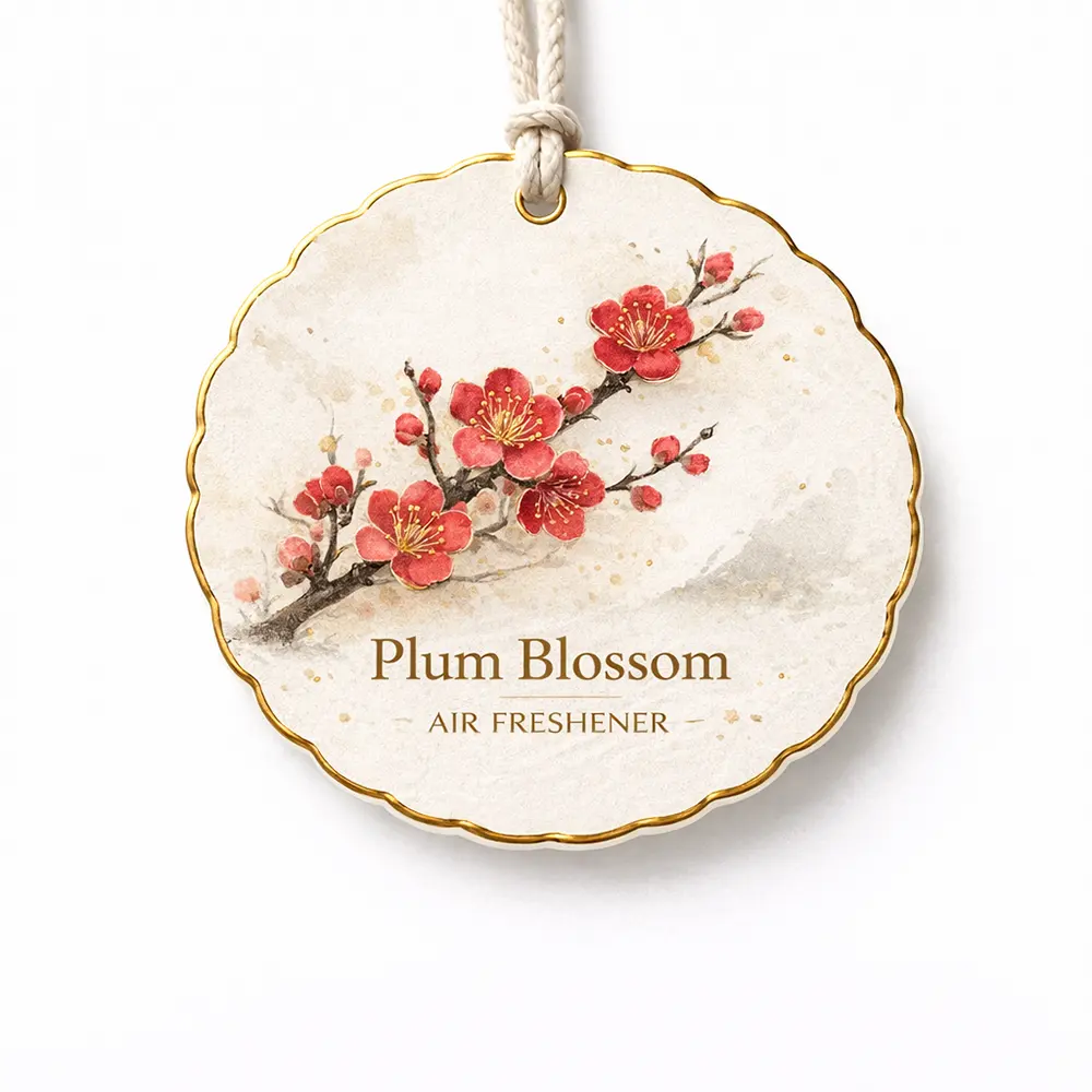 This refined plum blossom hanging paper air freshener captures the beauty of traditional oriental aesthetics, featuring delicate red blossoms on a branch with soft watercolor textures and subtle gold accents. Symbolizing resilience and elegance, it brings a sense of warmth and cultural charm to any space.