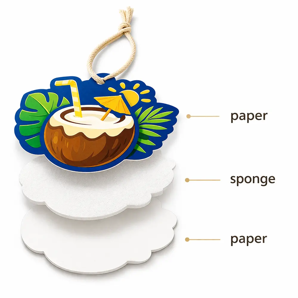 A hanging paper air freshener is a lightweight fragrance product designed to slowly release scent into the surrounding environment. Typically made with a paper + absorbent core (sponge) + paper structure, it allows fragrance oils to diffuse gradually, creating a long-lasting aromatic experience.