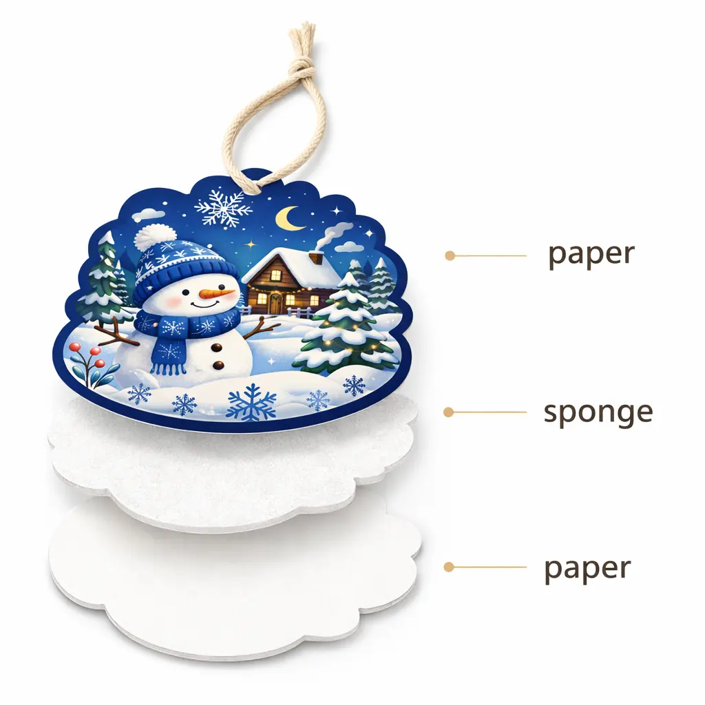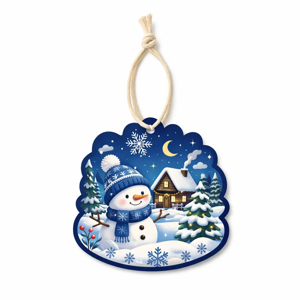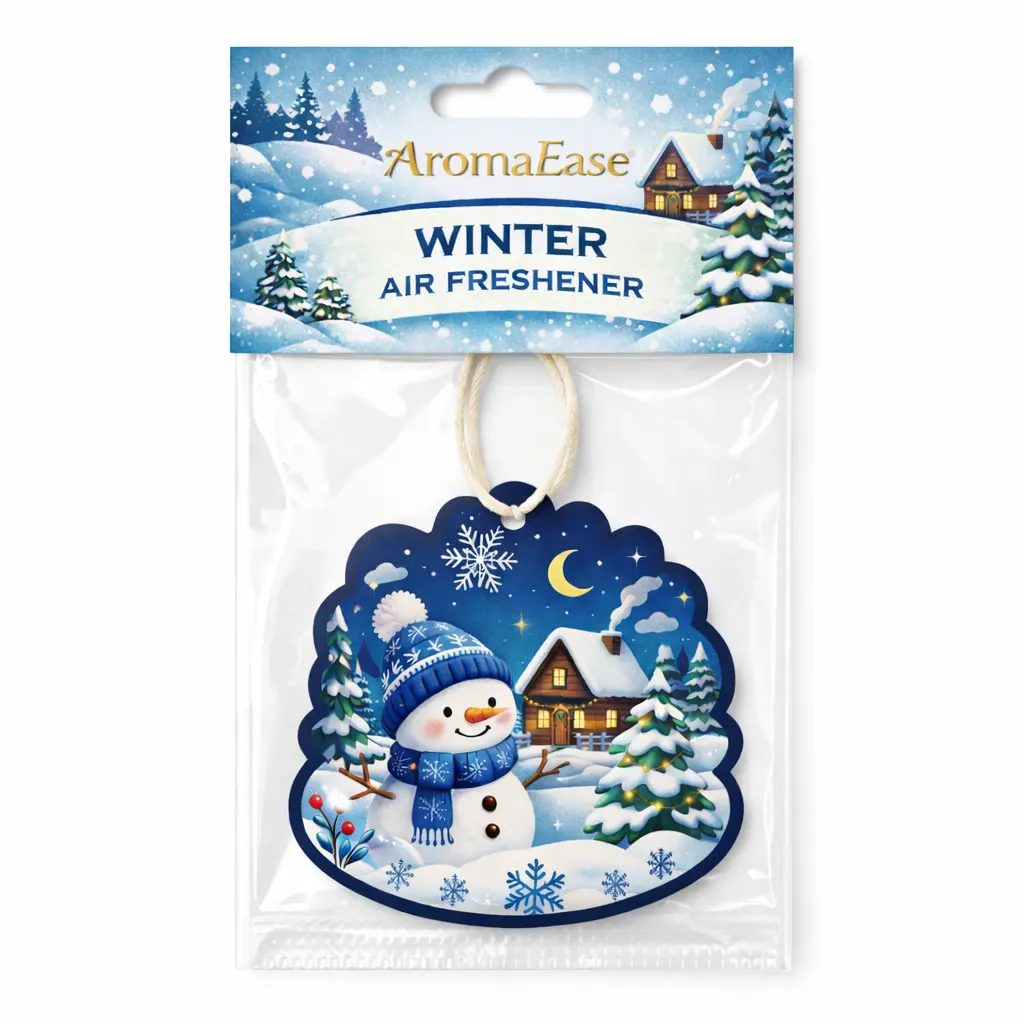 A snowman hanging air freshener is a seasonal scented paper product designed for both fragrance and festive decoration.
